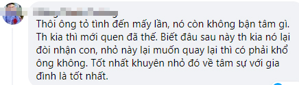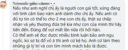 "Nói chung là cao thượng đấy. Nhưng đến lúc sống chung rồi đứa bé lớn dần lên. Rồi càng ngày không giống mình lẫn bên nội. Lời ra tiếng vào. Chịu được không? Rồi còn nhỡ gia đình bố thật đứa bé biết nó đến đòi nó thì sao. Lúc ấy nhiều cái xảy ra mà khó đỡ lắm. Quan trọng vẫn là mẹ đứa bé cũng không yêu bạn. Nên có sống cùng cũng khó à. Suy nghĩ thật kĩ trước khi lựa chọn bạn nhé", một bạn đọc bình luận.