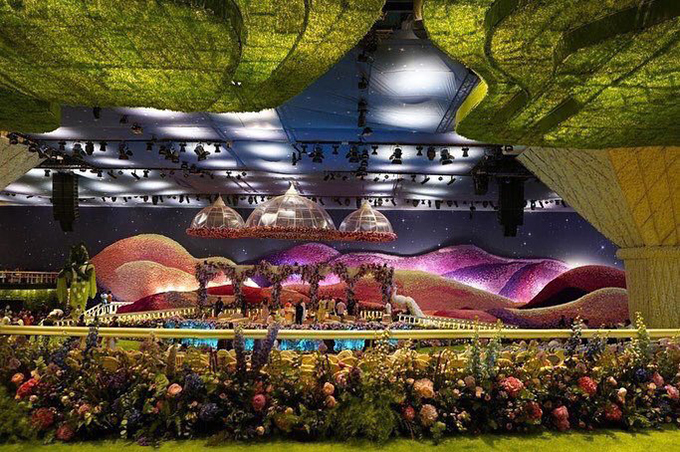 Không gian tiệc cưới được trang hoàng vô cùng xa hoa và công phu bằng hàng chục nghìn bông hoa tươi được vận chuyển từ nước ngoài về. Chủ đề của đám cưới là Khu vườn. Trong đó có hoa lá, thác nước giả, đài phun nước, sân khấu lớn và tượng Chúa Krishna trong đạo Hindu.