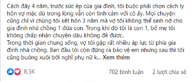 "Cách đây 4 năm, trước sức ép của gia đình, tôi buộc phải chọn cách ly hôn vợ mặc dù trong lòng vẫn còn tình cảm với cô ấy. Mọi chuyện cũng chỉ vì chúng tôi kết hôn 3 năm mà vợ tôi không thể sinh nở cho gia đình nhà chồng 1 đứa con. Trong khi đó tôi là con 1, bố mẹ tôi không chấp nhận chuyện dâu không đẻ được.