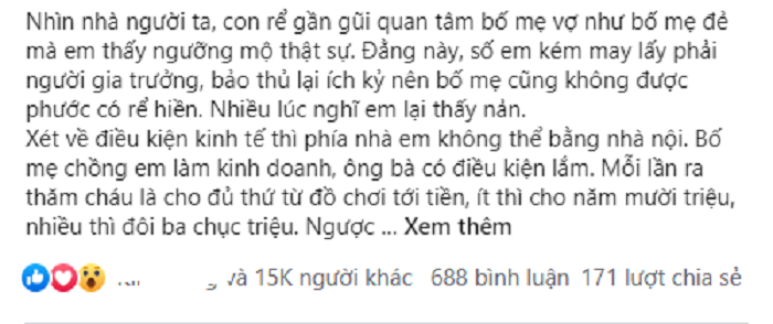 Nội dung câu chuyện như sau: “Nhìn nhà người ta, con rể gần gũi quan tâm bố mẹ vợ như bố mẹ đẻ mà em thấy ngưỡng mộ thật sự. Đằng này, số em kém may lấy phải người gia trưởng, bảo thủ lại ích kỷ nên bố mẹ cũng không được phước có rể hiền. Nhiều lúc nghĩ em lại thấy nản.