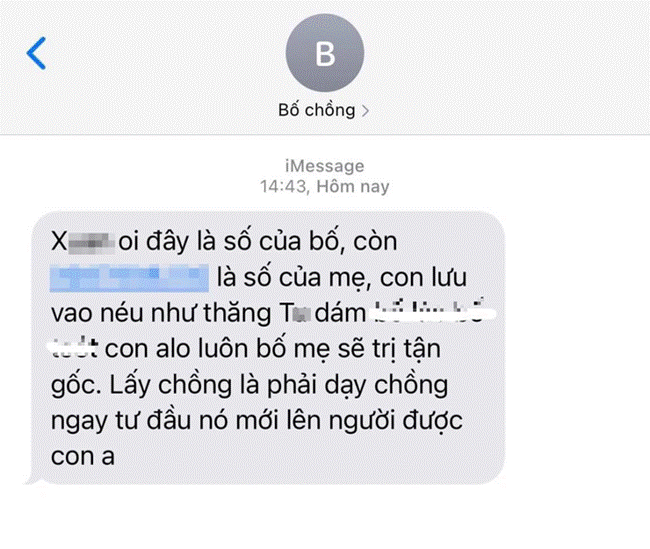"X. ơi, đây là số của bố, còn... là số của mẹ, con lưu vào nếu như thằng T. dám láo con gọi luôn bố mẹ sẽ trị tận gốc. Lấy chồng phải dạy chồng ngay từ đầu nó mới nên người được con ạ".