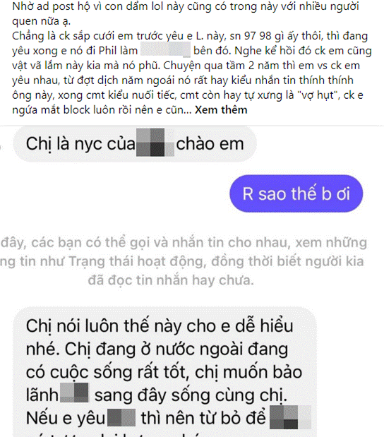 "Chẳng là chồng sắp cưới em trước yêu em L. này, sinh năm 1997 hay 1998 gì đấy thôi, đang yêu nhau thì em nó đi Philipines làm ăn.