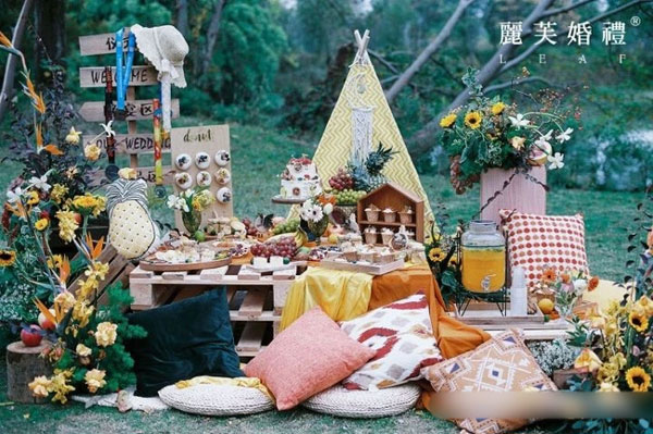 Đây là phong cách dã ngoại thích hợp với đám cưới ngoài trời. Khu vực tráng miệng có khung gỗ, gối đệm, lều mini.
