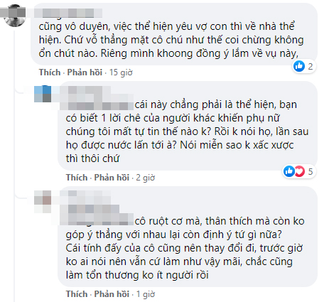 Bên cạnh đó, cũng có ý kiến cho rằng người chồng bênh vợ mà nói thẳng mặt cô, chú như vậy cũng không hay cho lắm vì thứ nhất làm người lớn mất lòng, thứ 2 khiến vợ khó xử và bị ác cảm về sau. Tuy nhiên phần đông lại nhận định rằng cách nói của người chồng có phần thẳng tính nhưng không láo toét và có xin phép dưới góc độ góp ý thiện chí nên hoàn toàn chấp nhận được, cũng không nên vì cả nể người nhà mà khiến vợ con bị ấm ức khó chịu.