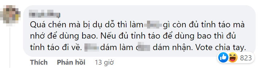 Như vậy, người chồng phủ định nghi vấn của người vợ, anh khẳng định mình “đã dùng đâu” nhưng cũng lại quá thành thật thừa nhận để “phòng trước”, “nhỡ may quá chén”. Với lối suy nghĩ này, có vẻ như đối với anh chồng chuyện chẳng may xảy ra “tai nạn”, ví dụ như quá chén mà quan hệ với phụ nữ khác là chuyện bình thường, sẽ có thể xảy ra và không việc gì phải giấu diếm vợ. Có lẽ người này còn cho rằng mình chuẩn bị sẵn bao cao su là tốt cho người vợ, nên cứ thế mà nói thẳng toẹt ra, thậm chí là mắng ngược lại vợ: “Em cứ nghĩ quá”.