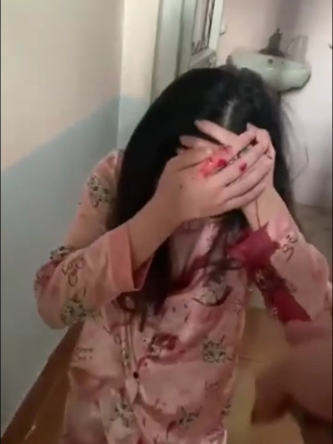 Cô gái bị thương ở đầu và quỳ dưới nền nhà. (Ảnh cắt từ clip)