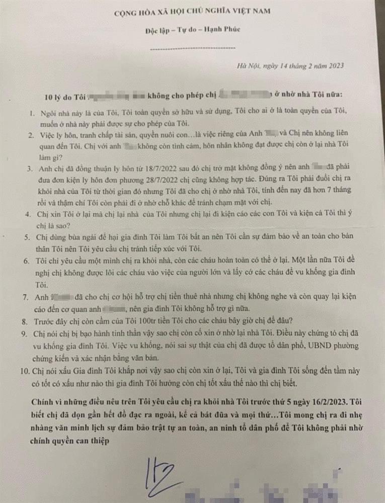 "Chính vì những điều nêu trên, tôi yêu cầu chị ra khỏi nhà tôi trước thứ 5 ngày 16/2/2023. Tôi biết chị đã dọn gần hết đồ đạc ra ngoài, kể cả bát đũa và mọi thứ... tôi mong chị ra đi nhẹ nhàng văn minh lịch sự đảm bảo trật tự an toàn, an ninh tổ dân phố để tôi không phải nhờ chính quyền can thiệp”, bà H. nêu.