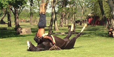 Động tác trồng cây chuối trên thân ngựa. |