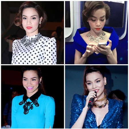 Không chỉ có Hồ Ngọc Hà mà rất nhiều người đẹp khác rất yêu thích kiểu vòng cổ đúc cá tính. Vì bờ vai và cánh tay khá gầy guộc nên Hồ Ngọc Hà thường xuyên chọn những kiểu váy kín đáo che đi nhược điểm này. Và để tăng sức hút cô luôn kết hợp các kiểu váy đó với vòng cổ ấn tượng.